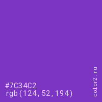 Цвет #7C34C2 в цветовой модели RGB обозначается тремя октетами (124, 52, 194) в десятичном формате и #7C34C2 в шестнадцатиричном (hex) формате, которые являются интенсивностью красного 124 (hex 7C), интенсивность зелёного 52 (hex 34) и интенсивность синего 194 (hex C2).