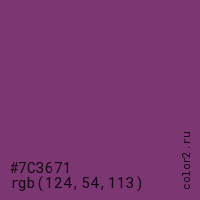 Цвет #7C3671 в цветовой модели RGB обозначается тремя октетами (124, 54, 113) в десятичном формате и #7C3671 в шестнадцатиричном (hex) формате, которые являются интенсивностью красного 124 (hex 7C), интенсивность зелёного 54 (hex 36) и интенсивность синего 113 (hex 71).