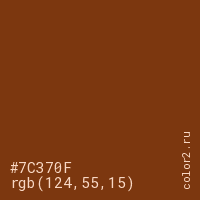 Цвет #7C370F в цветовой модели RGB обозначается тремя октетами (124, 55, 15) в десятичном формате и #7C370F в шестнадцатиричном (hex) формате, которые являются интенсивностью красного 124 (hex 7C), интенсивность зелёного 55 (hex 37) и интенсивность синего 15 (hex 0F).