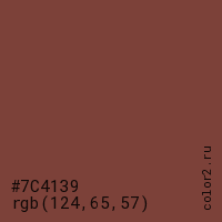 Цвет #7C4139 в цветовой модели RGB обозначается тремя октетами (124, 65, 57) в десятичном формате и #7C4139 в шестнадцатиричном (hex) формате, которые являются интенсивностью красного 124 (hex 7C), интенсивность зелёного 65 (hex 41) и интенсивность синего 57 (hex 39).