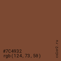Цвет #7C4932 в цветовой модели RGB обозначается тремя октетами (124, 73, 50) в десятичном формате и #7C4932 в шестнадцатиричном (hex) формате, которые являются интенсивностью красного 124 (hex 7C), интенсивность зелёного 73 (hex 49) и интенсивность синего 50 (hex 32).