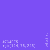 Цвет #7C4EF5 в цветовой модели RGB обозначается тремя октетами (124, 78, 245) в десятичном формате и #7C4EF5 в шестнадцатиричном (hex) формате, которые являются интенсивностью красного 124 (hex 7C), интенсивность зелёного 78 (hex 4E) и интенсивность синего 245 (hex F5).