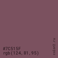 Цвет #7C515F в цветовой модели RGB обозначается тремя октетами (124, 81, 95) в десятичном формате и #7C515F в шестнадцатиричном (hex) формате, которые являются интенсивностью красного 124 (hex 7C), интенсивность зелёного 81 (hex 51) и интенсивность синего 95 (hex 5F).