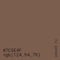 Цвет #7C5E4F в цветовой модели RGB обозначается тремя октетами (124, 94, 79) в десятичном формате и #7C5E4F в шестнадцатиричном (hex) формате, которые являются интенсивностью красного 124 (hex 7C), интенсивность зелёного 94 (hex 5E) и интенсивность синего 79 (hex 4F).