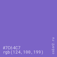 Цвет #7C64C7 в цветовой модели RGB обозначается тремя октетами (124, 100, 199) в десятичном формате и #7C64C7 в шестнадцатиричном (hex) формате, которые являются интенсивностью красного 124 (hex 7C), интенсивность зелёного 100 (hex 64) и интенсивность синего 199 (hex C7).