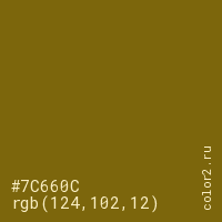 Цвет #7C660C в цветовой модели RGB обозначается тремя октетами (124, 102, 12) в десятичном формате и #7C660C в шестнадцатиричном (hex) формате, которые являются интенсивностью красного 124 (hex 7C), интенсивность зелёного 102 (hex 66) и интенсивность синего 12 (hex 0C).