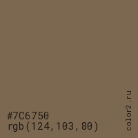Цвет #7C6750 в цветовой модели RGB обозначается тремя октетами (124, 103, 80) в десятичном формате и #7C6750 в шестнадцатиричном (hex) формате, которые являются интенсивностью красного 124 (hex 7C), интенсивность зелёного 103 (hex 67) и интенсивность синего 80 (hex 50).
