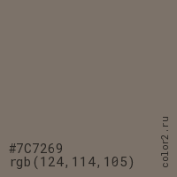 Цвет #7C7269 в цветовой модели RGB обозначается тремя октетами (124, 114, 105) в десятичном формате и #7C7269 в шестнадцатиричном (hex) формате, которые являются интенсивностью красного 124 (hex 7C), интенсивность зелёного 114 (hex 72) и интенсивность синего 105 (hex 69).