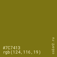 Цвет #7C7413 в цветовой модели RGB обозначается тремя октетами (124, 116, 19) в десятичном формате и #7C7413 в шестнадцатиричном (hex) формате, которые являются интенсивностью красного 124 (hex 7C), интенсивность зелёного 116 (hex 74) и интенсивность синего 19 (hex 13).