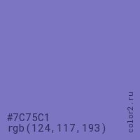 Цвет #7C75C1 в цветовой модели RGB обозначается тремя октетами (124, 117, 193) в десятичном формате и #7C75C1 в шестнадцатиричном (hex) формате, которые являются интенсивностью красного 124 (hex 7C), интенсивность зелёного 117 (hex 75) и интенсивность синего 193 (hex C1).