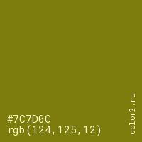 Цвет #7C7D0C в цветовой модели RGB обозначается тремя октетами (124, 125, 12) в десятичном формате и #7C7D0C в шестнадцатиричном (hex) формате, которые являются интенсивностью красного 124 (hex 7C), интенсивность зелёного 125 (hex 7D) и интенсивность синего 12 (hex 0C).