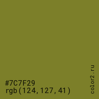 Цвет #7C7F29 в цветовой модели RGB обозначается тремя октетами (124, 127, 41) в десятичном формате и #7C7F29 в шестнадцатиричном (hex) формате, которые являются интенсивностью красного 124 (hex 7C), интенсивность зелёного 127 (hex 7F) и интенсивность синего 41 (hex 29).