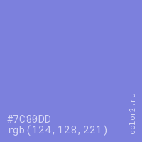 Цвет #7C80DD в цветовой модели RGB обозначается тремя октетами (124, 128, 221) в десятичном формате и #7C80DD в шестнадцатиричном (hex) формате, которые являются интенсивностью красного 124 (hex 7C), интенсивность зелёного 128 (hex 80) и интенсивность синего 221 (hex DD).