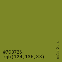 Цвет #7C8726 в цветовой модели RGB обозначается тремя октетами (124, 135, 38) в десятичном формате и #7C8726 в шестнадцатиричном (hex) формате, которые являются интенсивностью красного 124 (hex 7C), интенсивность зелёного 135 (hex 87) и интенсивность синего 38 (hex 26).