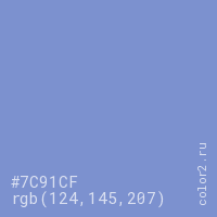 Цвет #7C91CF в цветовой модели RGB обозначается тремя октетами (124, 145, 207) в десятичном формате и #7C91CF в шестнадцатиричном (hex) формате, которые являются интенсивностью красного 124 (hex 7C), интенсивность зелёного 145 (hex 91) и интенсивность синего 207 (hex CF).