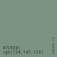 Цвет #7C9381 в цветовой модели RGB обозначается тремя октетами (124, 147, 129) в десятичном формате и #7C9381 в шестнадцатиричном (hex) формате, которые являются интенсивностью красного 124 (hex 7C), интенсивность зелёного 147 (hex 93) и интенсивность синего 129 (hex 81).