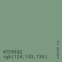 Цвет #7C9982 в цветовой модели RGB обозначается тремя октетами (124, 153, 130) в десятичном формате и #7C9982 в шестнадцатиричном (hex) формате, которые являются интенсивностью красного 124 (hex 7C), интенсивность зелёного 153 (hex 99) и интенсивность синего 130 (hex 82).