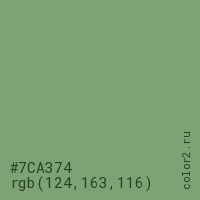 Цвет #7CA374 в цветовой модели RGB обозначается тремя октетами (124, 163, 116) в десятичном формате и #7CA374 в шестнадцатиричном (hex) формате, которые являются интенсивностью красного 124 (hex 7C), интенсивность зелёного 163 (hex A3) и интенсивность синего 116 (hex 74).