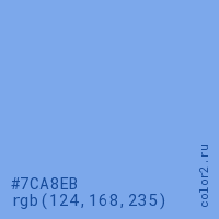 Цвет #7CA8EB в цветовой модели RGB обозначается тремя октетами (124, 168, 235) в десятичном формате и #7CA8EB в шестнадцатиричном (hex) формате, которые являются интенсивностью красного 124 (hex 7C), интенсивность зелёного 168 (hex A8) и интенсивность синего 235 (hex EB).