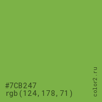 Цвет #7CB247 в цветовой модели RGB обозначается тремя октетами (124, 178, 71) в десятичном формате и #7CB247 в шестнадцатиричном (hex) формате, которые являются интенсивностью красного 124 (hex 7C), интенсивность зелёного 178 (hex B2) и интенсивность синего 71 (hex 47).
