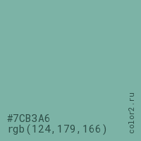 Цвет #7CB3A6 в цветовой модели RGB обозначается тремя октетами (124, 179, 166) в десятичном формате и #7CB3A6 в шестнадцатиричном (hex) формате, которые являются интенсивностью красного 124 (hex 7C), интенсивность зелёного 179 (hex B3) и интенсивность синего 166 (hex A6).