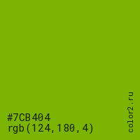 Цвет #7CB404 в цветовой модели RGB обозначается тремя октетами (124, 180, 4) в десятичном формате и #7CB404 в шестнадцатиричном (hex) формате, которые являются интенсивностью красного 124 (hex 7C), интенсивность зелёного 180 (hex B4) и интенсивность синего 4 (hex 04).