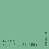 Цвет #7CB596 в цветовой модели RGB обозначается тремя октетами (124, 181, 150) в десятичном формате и #7CB596 в шестнадцатиричном (hex) формате, которые являются интенсивностью красного 124 (hex 7C), интенсивность зелёного 181 (hex B5) и интенсивность синего 150 (hex 96).