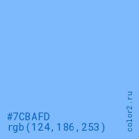 Цвет #7CBAFD в цветовой модели RGB обозначается тремя октетами (124, 186, 253) в десятичном формате и #7CBAFD в шестнадцатиричном (hex) формате, которые являются интенсивностью красного 124 (hex 7C), интенсивность зелёного 186 (hex BA) и интенсивность синего 253 (hex FD).