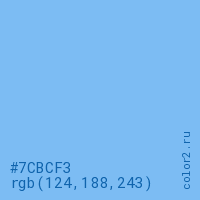 Цвет #7CBCF3 в цветовой модели RGB обозначается тремя октетами (124, 188, 243) в десятичном формате и #7CBCF3 в шестнадцатиричном (hex) формате, которые являются интенсивностью красного 124 (hex 7C), интенсивность зелёного 188 (hex BC) и интенсивность синего 243 (hex F3).