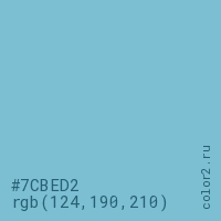 Цвет #7CBED2 в цветовой модели RGB обозначается тремя октетами (124, 190, 210) в десятичном формате и #7CBED2 в шестнадцатиричном (hex) формате, которые являются интенсивностью красного 124 (hex 7C), интенсивность зелёного 190 (hex BE) и интенсивность синего 210 (hex D2).