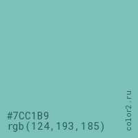 Цвет #7CC1B9 в цветовой модели RGB обозначается тремя октетами (124, 193, 185) в десятичном формате и #7CC1B9 в шестнадцатиричном (hex) формате, которые являются интенсивностью красного 124 (hex 7C), интенсивность зелёного 193 (hex C1) и интенсивность синего 185 (hex B9).