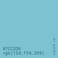 Цвет #7CC2D0 в цветовой модели RGB обозначается тремя октетами (124, 194, 208) в десятичном формате и #7CC2D0 в шестнадцатиричном (hex) формате, которые являются интенсивностью красного 124 (hex 7C), интенсивность зелёного 194 (hex C2) и интенсивность синего 208 (hex D0).