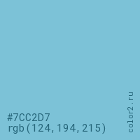 Цвет #7CC2D7 в цветовой модели RGB обозначается тремя октетами (124, 194, 215) в десятичном формате и #7CC2D7 в шестнадцатиричном (hex) формате, которые являются интенсивностью красного 124 (hex 7C), интенсивность зелёного 194 (hex C2) и интенсивность синего 215 (hex D7).