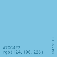 Цвет #7CC4E2 в цветовой модели RGB обозначается тремя октетами (124, 196, 226) в десятичном формате и #7CC4E2 в шестнадцатиричном (hex) формате, которые являются интенсивностью красного 124 (hex 7C), интенсивность зелёного 196 (hex C4) и интенсивность синего 226 (hex E2).