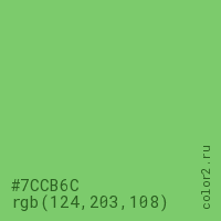 Цвет #7CCB6C в цветовой модели RGB обозначается тремя октетами (124, 203, 108) в десятичном формате и #7CCB6C в шестнадцатиричном (hex) формате, которые являются интенсивностью красного 124 (hex 7C), интенсивность зелёного 203 (hex CB) и интенсивность синего 108 (hex 6C).