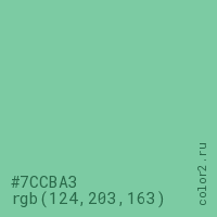 Цвет #7CCBA3 в цветовой модели RGB обозначается тремя октетами (124, 203, 163) в десятичном формате и #7CCBA3 в шестнадцатиричном (hex) формате, которые являются интенсивностью красного 124 (hex 7C), интенсивность зелёного 203 (hex CB) и интенсивность синего 163 (hex A3).