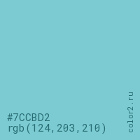 Цвет #7CCBD2 в цветовой модели RGB обозначается тремя октетами (124, 203, 210) в десятичном формате и #7CCBD2 в шестнадцатиричном (hex) формате, которые являются интенсивностью красного 124 (hex 7C), интенсивность зелёного 203 (hex CB) и интенсивность синего 210 (hex D2).