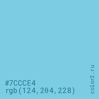 Цвет #7CCCE4 в цветовой модели RGB обозначается тремя октетами (124, 204, 228) в десятичном формате и #7CCCE4 в шестнадцатиричном (hex) формате, которые являются интенсивностью красного 124 (hex 7C), интенсивность зелёного 204 (hex CC) и интенсивность синего 228 (hex E4).