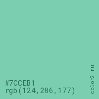 Цвет #7CCEB1 в цветовой модели RGB обозначается тремя октетами (124, 206, 177) в десятичном формате и #7CCEB1 в шестнадцатиричном (hex) формате, которые являются интенсивностью красного 124 (hex 7C), интенсивность зелёного 206 (hex CE) и интенсивность синего 177 (hex B1).