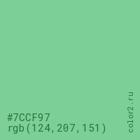 Цвет #7CCF97 в цветовой модели RGB обозначается тремя октетами (124, 207, 151) в десятичном формате и #7CCF97 в шестнадцатиричном (hex) формате, которые являются интенсивностью красного 124 (hex 7C), интенсивность зелёного 207 (hex CF) и интенсивность синего 151 (hex 97).