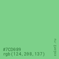 Цвет #7CD089 в цветовой модели RGB обозначается тремя октетами (124, 208, 137) в десятичном формате и #7CD089 в шестнадцатиричном (hex) формате, которые являются интенсивностью красного 124 (hex 7C), интенсивность зелёного 208 (hex D0) и интенсивность синего 137 (hex 89).