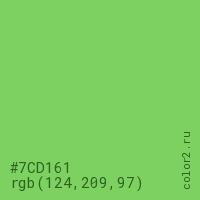 Цвет #7CD161 в цветовой модели RGB обозначается тремя октетами (124, 209, 97) в десятичном формате и #7CD161 в шестнадцатиричном (hex) формате, которые являются интенсивностью красного 124 (hex 7C), интенсивность зелёного 209 (hex D1) и интенсивность синего 97 (hex 61).
