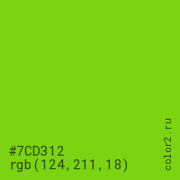 Цвет #7CD312 в цветовой модели RGB обозначается тремя октетами (124, 211, 18) в десятичном формате и #7CD312 в шестнадцатиричном (hex) формате, которые являются интенсивностью красного 124 (hex 7C), интенсивность зелёного 211 (hex D3) и интенсивность синего 18 (hex 12).
