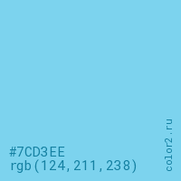Цвет #7CD3EE в цветовой модели RGB обозначается тремя октетами (124, 211, 238) в десятичном формате и #7CD3EE в шестнадцатиричном (hex) формате, которые являются интенсивностью красного 124 (hex 7C), интенсивность зелёного 211 (hex D3) и интенсивность синего 238 (hex EE).