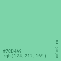 Цвет #7CD4A9 в цветовой модели RGB обозначается тремя октетами (124, 212, 169) в десятичном формате и #7CD4A9 в шестнадцатиричном (hex) формате, которые являются интенсивностью красного 124 (hex 7C), интенсивность зелёного 212 (hex D4) и интенсивность синего 169 (hex A9).