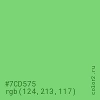 Цвет #7CD575 в цветовой модели RGB обозначается тремя октетами (124, 213, 117) в десятичном формате и #7CD575 в шестнадцатиричном (hex) формате, которые являются интенсивностью красного 124 (hex 7C), интенсивность зелёного 213 (hex D5) и интенсивность синего 117 (hex 75).