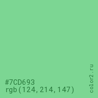 Цвет #7CD693 в цветовой модели RGB обозначается тремя октетами (124, 214, 147) в десятичном формате и #7CD693 в шестнадцатиричном (hex) формате, которые являются интенсивностью красного 124 (hex 7C), интенсивность зелёного 214 (hex D6) и интенсивность синего 147 (hex 93).