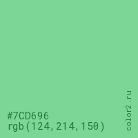 Цвет #7CD696 в цветовой модели RGB обозначается тремя октетами (124, 214, 150) в десятичном формате и #7CD696 в шестнадцатиричном (hex) формате, которые являются интенсивностью красного 124 (hex 7C), интенсивность зелёного 214 (hex D6) и интенсивность синего 150 (hex 96).
