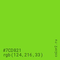 Цвет #7CD821 в цветовой модели RGB обозначается тремя октетами (124, 216, 33) в десятичном формате и #7CD821 в шестнадцатиричном (hex) формате, которые являются интенсивностью красного 124 (hex 7C), интенсивность зелёного 216 (hex D8) и интенсивность синего 33 (hex 21).