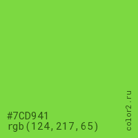 Цвет #7CD941 в цветовой модели RGB обозначается тремя октетами (124, 217, 65) в десятичном формате и #7CD941 в шестнадцатиричном (hex) формате, которые являются интенсивностью красного 124 (hex 7C), интенсивность зелёного 217 (hex D9) и интенсивность синего 65 (hex 41).
